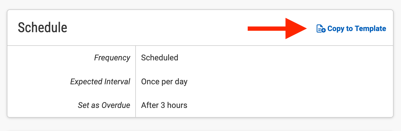 If you'd like to copy settings from an existing check to a template, simply view the check you'd like to copy settings from. You'll see new Copy to Template buttons in the Status, Schedule & Notifications sections.