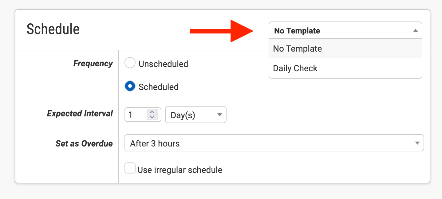 To use your new templates, you can use the new Template selector when creating or editing a check. You'll see this dropdown in the Schedule, Status & Notifications sections when creating or editing a check: