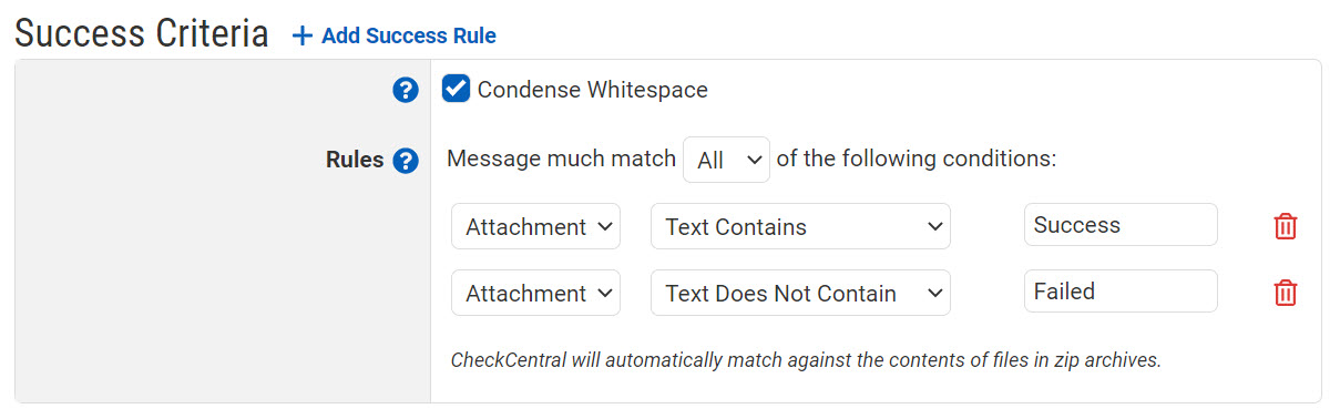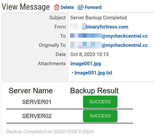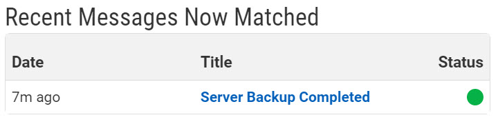 We're excited to announce that we've added the ability to do status matching against text that's in images! In the example message below, the two green "success" boxes are images instead of text. When a message that contains images arrives to your CheckCentral organization, CheckCentral will perform OCR on the image, and place the results in a .txt attachment with the message.