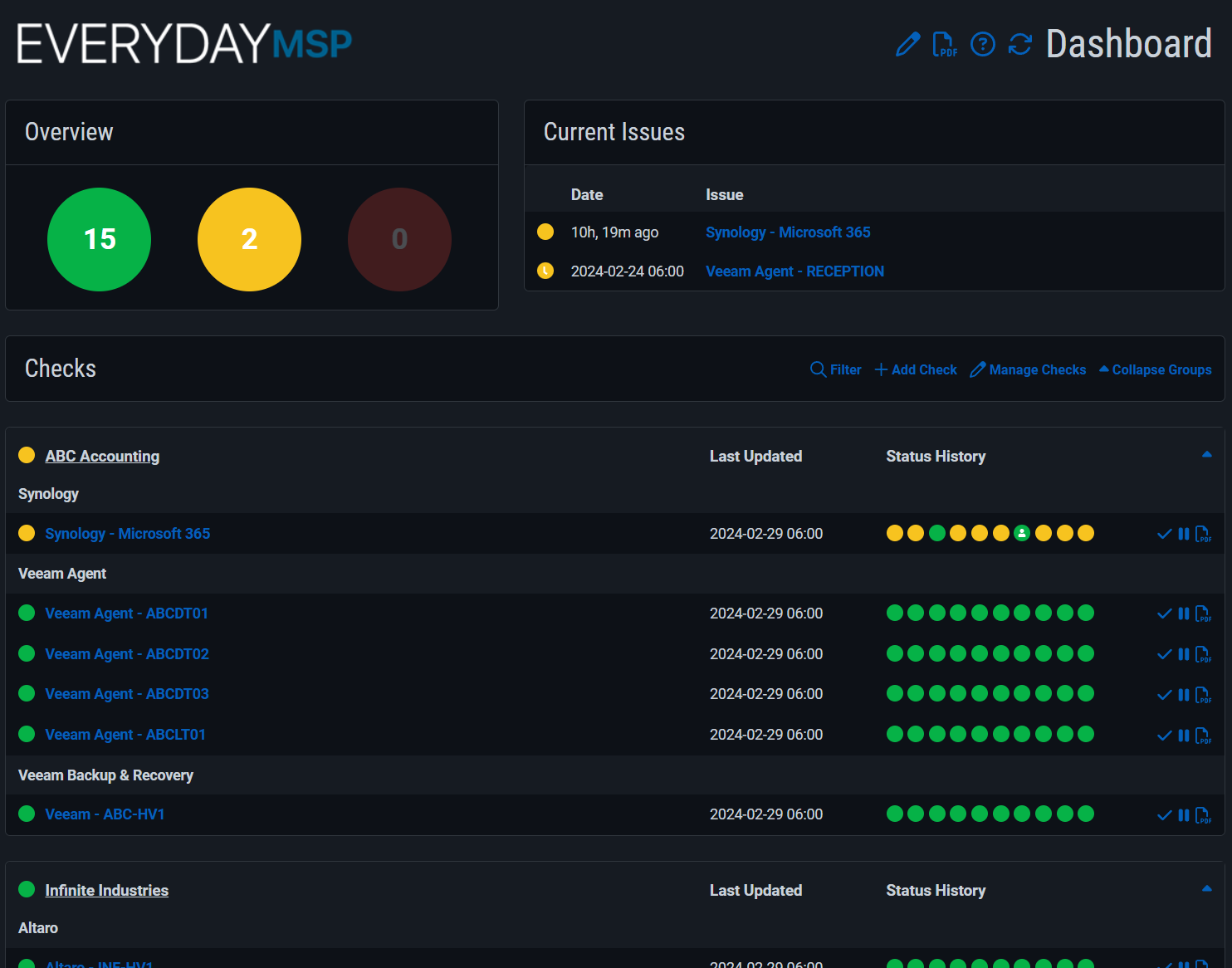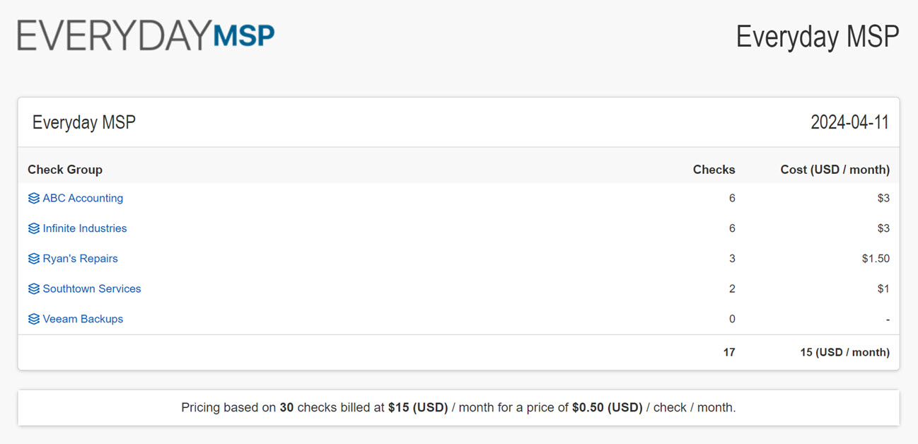 We're pleased to announce that we've added a new "Billing" report type. This report shows the cost of your org, and breaks it down by Check Group. This report type will be most useful for MSPs who use separate Check Groups for each client.