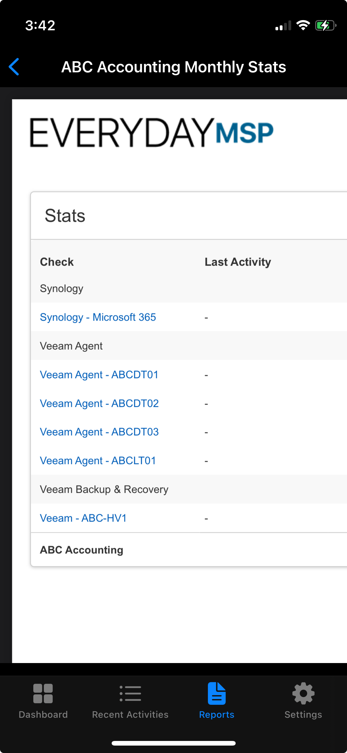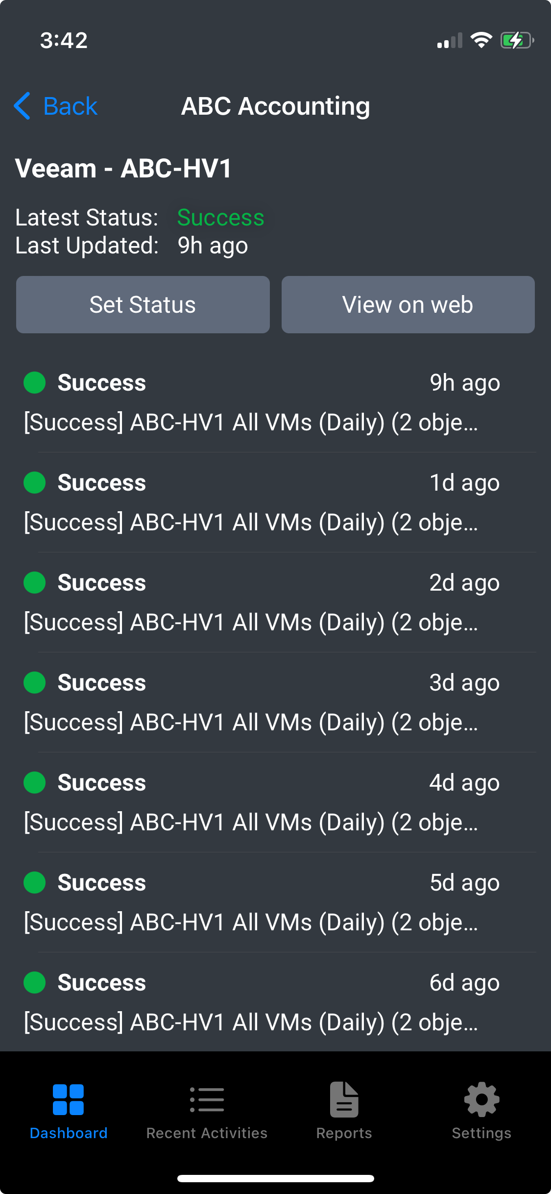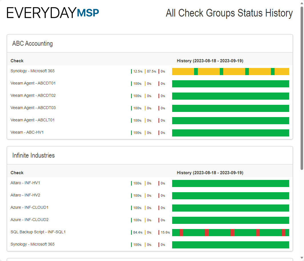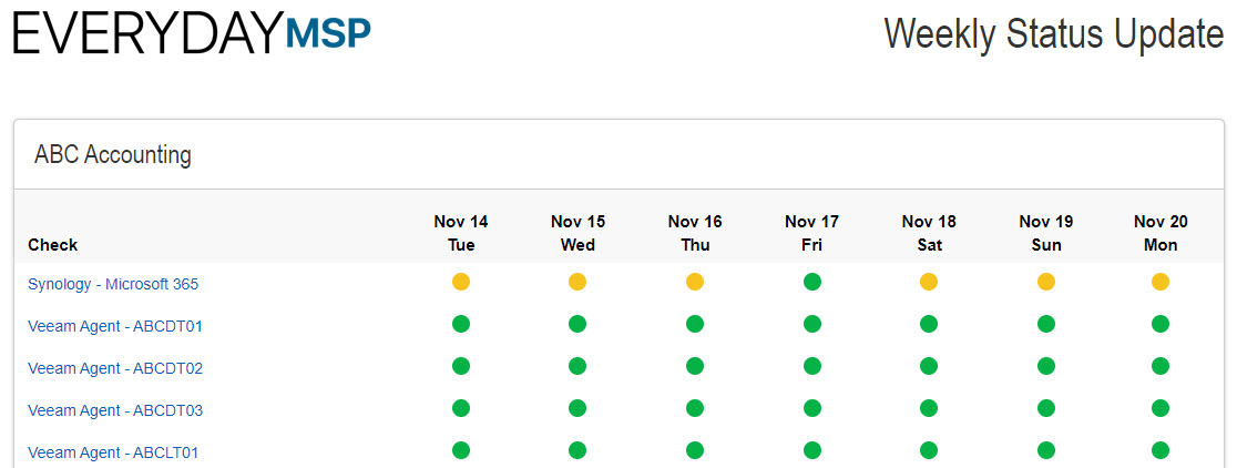 We're excited to announce that we've added a new "Weekly Status" report type. This report shows the status history for your checks for the last 7 days (from the day the report was run). If there are multiple activities on the same day for a check, the report will show the "worst" status for that day.
