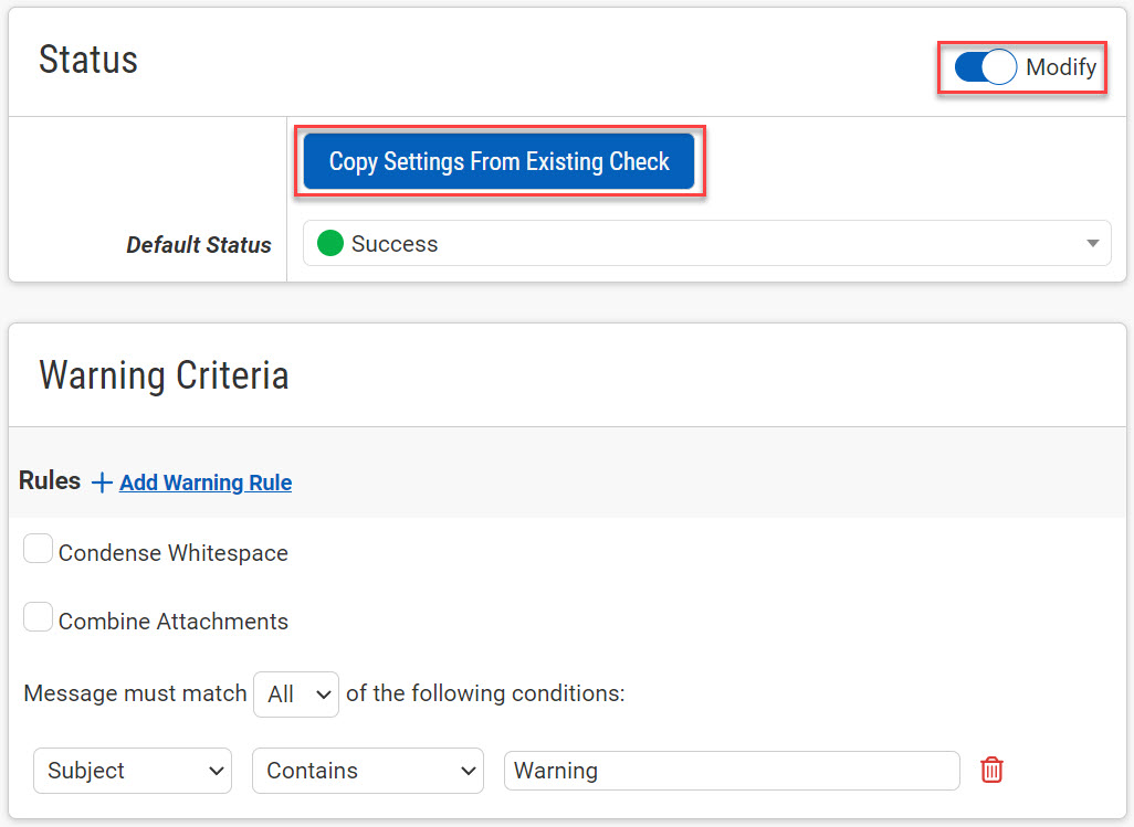 • Click the "Modify" toggle next to the check settings you want to edit. From there, you can use the "Copy Settings From Existing" check, or you can manually choose the values you want to change. Note that the values shown initially are not representative of the current state of the selected checks, they are just defaults.