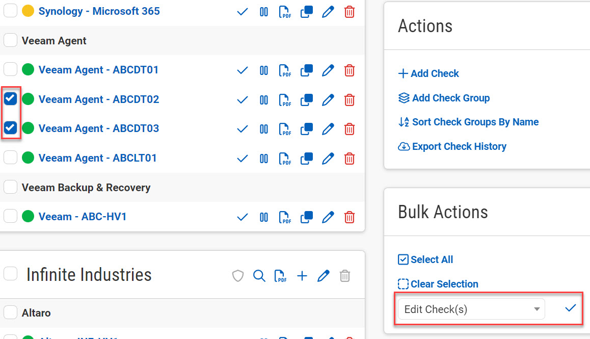 • Click the checkboxes next to the checks you'd like to modify. Next, in the "Bulk Actions" box on the right-side of the page, select "Edit Check(s)" from the drop-down, then click the checkmark icon.