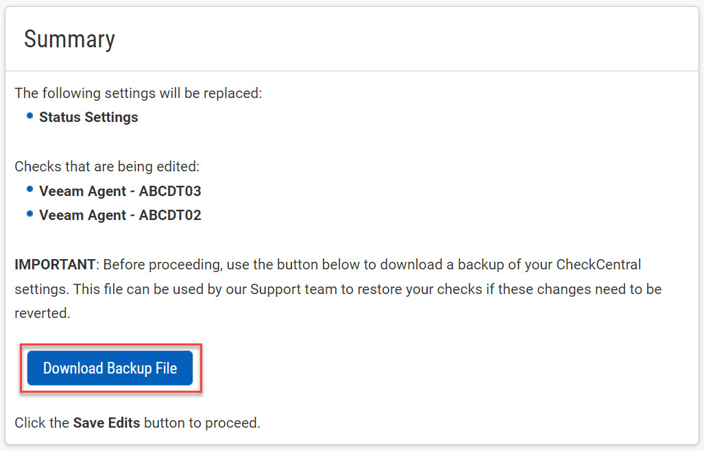 • When you've finished changing the settings, click the "Download Backup File" button to save a JSON file with the current check configuration. If you run into trouble with your checks after editing, the CheckCentral support team can use the backup file to troubleshoot and restore your previous configuration if needed.